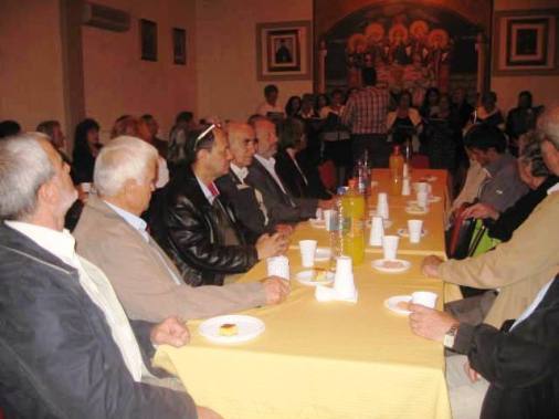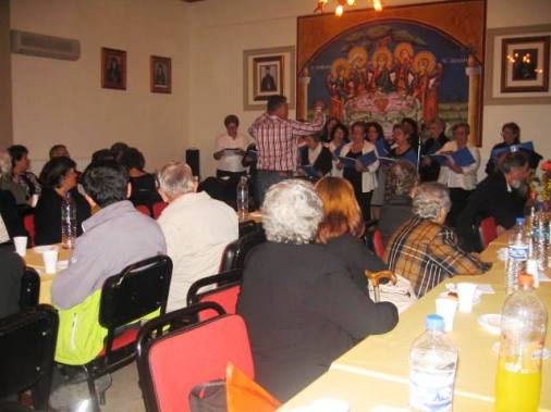 Στὴν αἴθουσα τοῦ ναοῦ ἡ χορωδία τοῦ Ι.Ν. ἁγίου Χαραλάμπους μὲ χοράρχη τὸν κ. Γεώργιο Γκούνα εὔφρανε μὲ παραδοσιακὰ τραγούδια τὰ παρευρισκόμενα μέλη ποὺ ἀνταποκρίθηκαν στὴν πρόσκληση τοῦ Δ.Συμβουλίου.