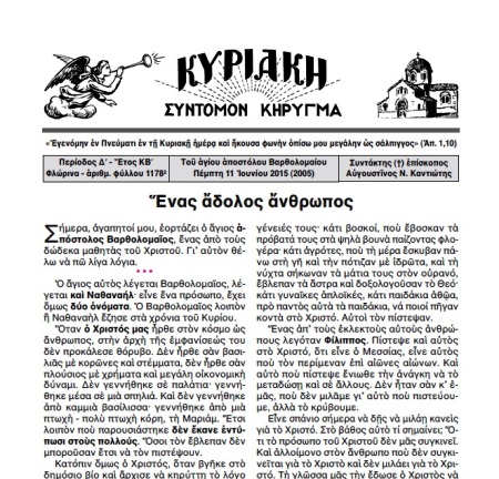 Τοῦ ἁγίου ἀποστόλου Βαρθολομαίου, Πέμπτη 11 Ἰουνίου 2015, “Ἕνας ἄδολος ἄνθρωπος”, Συντάκτης (†) ἐπίσκοπος Αὐγουστῖνος Ν. Καντιώτης Published 10 Ιουνίου 2015 | By Αβραάμ Σαλασίδης To κήρυγμα σε pdf