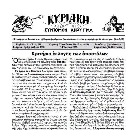 “Κριτήρια ἐκλογῆς τῶν ἀποστόλων”, Κυριακὴ Β΄ Ματθαίου (Ματθ. 4,18-23) 14 Ἰουνίου 2015, Συντάκτης (†) ἐπίσκοπος Αὐγουστῖνος Ν. Καντιώτης Published 11 Ιουνίου 2015 | By Αβραάμ Σαλασίδης Το κήρυγμα σε pdf