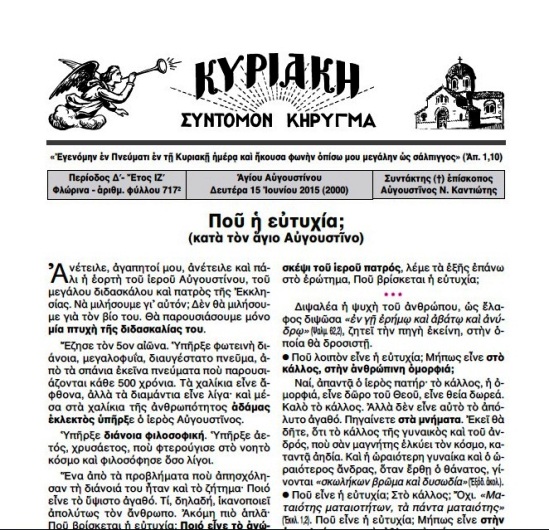 Ἁγίου Αὐγουστίνου, “Ποῦ ἡ εὐτυχία;” (κατὰ τὸν ἅγιο Αὐγουστῖνο), Συντάκτης (†) ἐπίσκοπος Αὐγουστῖνος Ν. Καντιώτης Published 11 Ιουνίου 2015 | By Αβραάμ Σαλασίδης Το κήρυγμα σε pdf