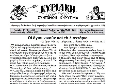 Κυριακὴ Ἁγ. Πάντων (Ἑβρ. 11,33 – 12,2), 7 Ἰουνίου 2015, “Οἱ ἅγιοι νικοῦν καὶ τὰ λιοντάρια”, Συντάκτης (†) ἐπίσκοπος Αὐγουστῖνος Ν. Καντιώτης Published 5 Ιουνίου 2015 | By Αβραάμ Σαλασίδης το κήρυγμα σε pdf