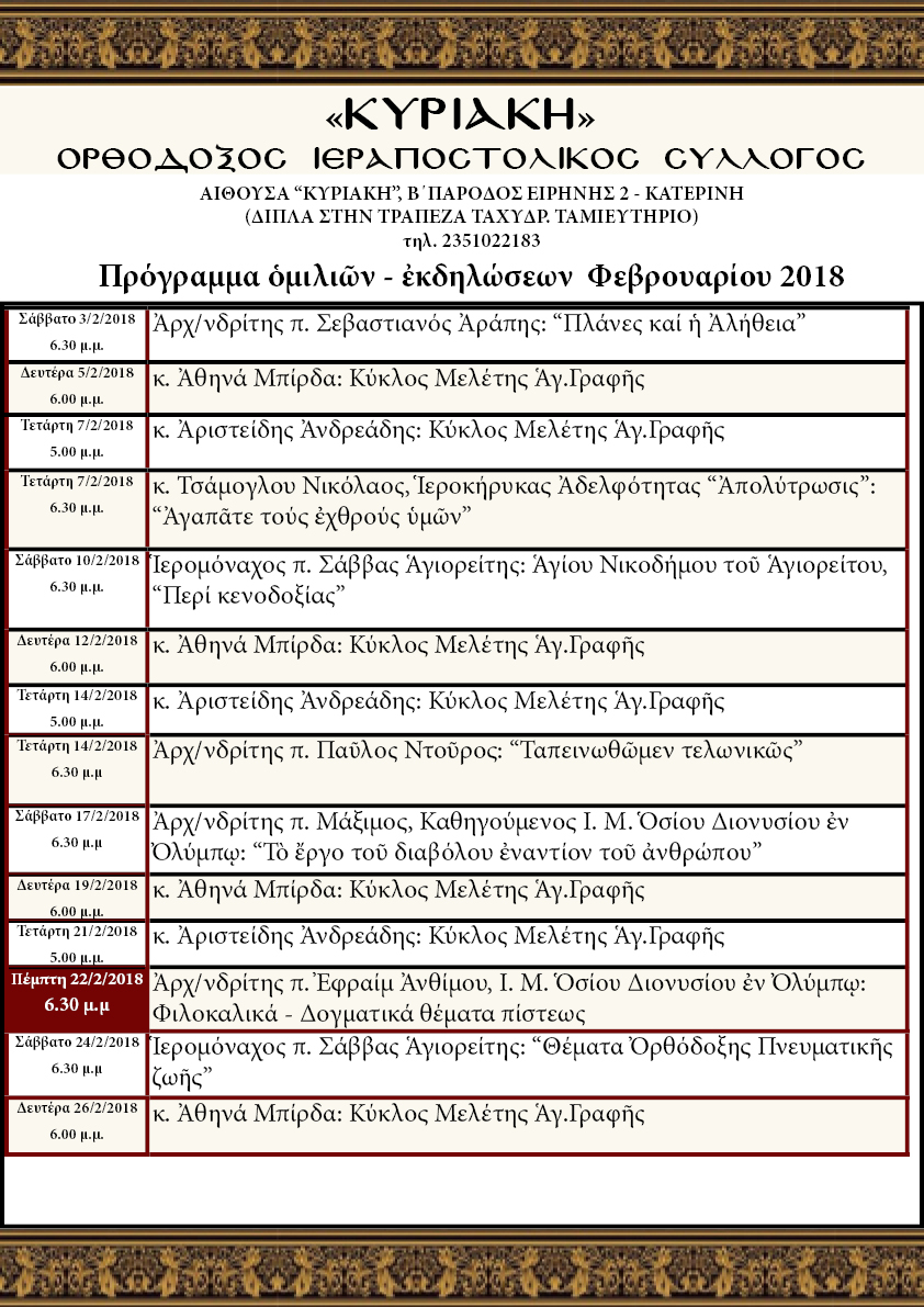 Τά 22 Ὀρθόδοξα Χριστιανικά Σωματεῖα τῆς Θεσσαλονίκης συμμετέχουν στό συλλαλητήριο τῶν Ἀθηνῶν γιά τήν Μακεδονία. * Κανεὶς δὲν δικαιοῦται νὰ διαστρεβλώνει οὔτε σημεῖο τῆς ἔνδοξης ἱστορίας μας. * Τὸ ὄνομά μας εἶναι ἡ ψυχή μας! * Δὲν τὸ διαπραγματευόμαστε! * Δὲν τὸ ἐκχωροῦμε σὲ κανέναν! * Δὲν τὸ προδίδουμε! * Δὲν δεχόμαστε καμία ὀνομασία ποὺ νὰ περιέχει τὸν ὄρο… Διαβάστε Περισσότερα