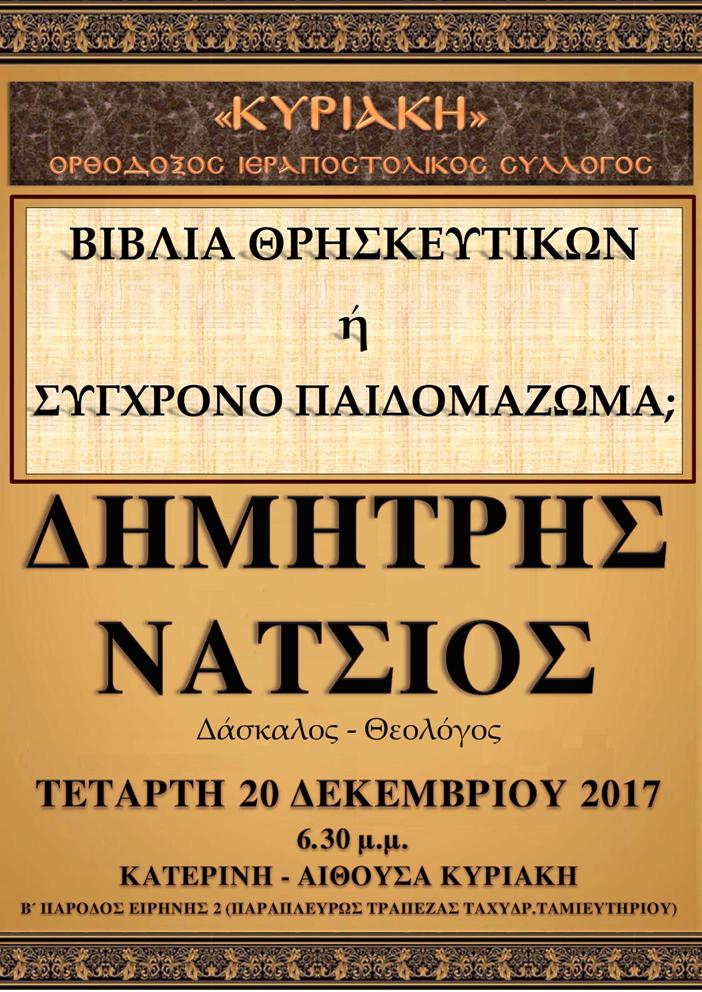 Το Σάββατο 9 Δεκεμβρίου 2017 και ώρα 6.30 μ.μ., στην αίθουσα «Κυριακή» Β Πάροδος, Ειρήνης 2 (Κέντρο, παραπλεύρως Ταχυδρ. Ταμιευτηρίου) στην Κατερίνη, ο Αρχιμ/της Σάββας Αγιορείτης, στο πλαίσιο των θεμάτων ορθόδοξης πνευματικής ζωής, θα αναπτύξει το θέμα: Η Ορθόδοξη Διδασκαλία για την μετά θάνατο ζωή (του π. Σεραφείμ Ρόουζ)