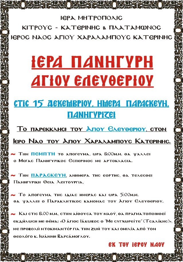 ΠΑΡΑΚΑΛΕΙΣΤΕ ΝΑ ΣΥΜΜΕΤΑΣΧΕΤΕ ΣΤΗΝ ΕΚΔΗΛΩΣΗ ΓΙΑ ΤΟΝ ΝΕΟ ΑΓΙΟ ΤΗΣ ΕΚΚΛΗΣΙΑΣ ΜΑΣ, ΑΓ. ΙΑΚΩΒΟ ΤΣΑΛΙΚΗ ΤΗΝ ΠΑΡΑΣΚΕΥΗ 15/12, ΣΤΙΣ 6.00 Μ.Μ. ΣΤΗΝ ΑΙΘΟΥΣΑ ΤΟΥ Ι. ΝΑΟΥ ΑΓ.ΧΑΡΑΛΑΜΠΟΥΣ. ΠΑΡΟΥΣΙΑΣΗ ΤΟΥ ΑΓΙΟΥ ΒΙΟΥ ΤΟΥ ΜΕ ΠΡΟΒΟΛΗ ΚΑΙ ΟΜΙΛΙΑ ΑΠΟ ΤΟΝ ΘΕΟΛΟΓΟ Ι. ΒΑΡΣΑΜΟΓΛOY. ΔΙΟΡΓΑΝΩΣΗ: ΙΕΡΟΣ ΝΑΟΣ ΑΓ. ΧΑΡΑΛΑΜΠΟΥΣ – ΙΕΡΑΠ.ΣΥΛΛΟΓΟΣ ΚΥΡΙΑΚΗ
