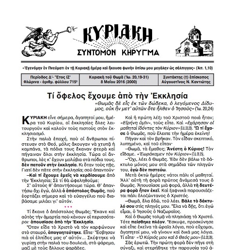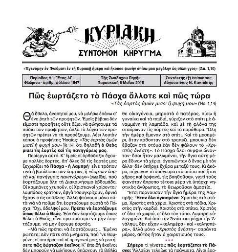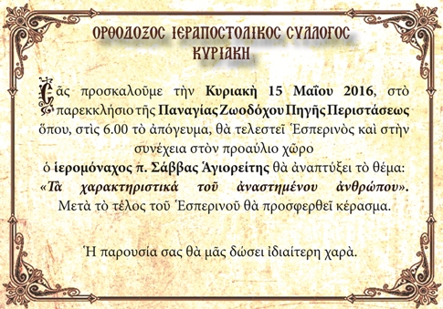 Την Κυριακή 15 Μαΐου 2016 ο ιεραποστολικός σύλλογος «Κυριακή» πραγματοποίησε στο παρεκκλήσιο της Ζωοδόχου Πηγής στην Περίσταση, εσπερινό και ομιλία από τον π. Σάββα τον Αγιορείτη με θέμα: «Tα χαρακτηριστικά του Αναστημένου ανθρώπου».