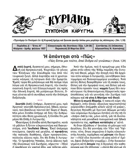 Η 25η Μαρτίου, για ‘μάς τους Έλληνες, είναι πνευματικό πανδοχείο, που προσφέρει διπλή ανάπαυση και διπλό ανεφοδιασμό. Και ο λόγος είναι, ότι την ίδια μέρα εορτάζουμε δυο μοναδικές και ανεπανάληπτες ελευθερίες μας. Πρώτα την ελευθερία από τα δεσμά του θανάτου λόγω της αμαρτίας, και έπειτα την ελευθερία του Γένους μας από την τουρκική σκλαβιά.