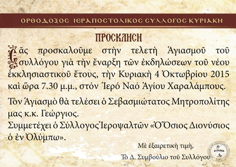 Τὸν Ἁγιασμὸ γιὰ τὴν ἔναρξη τῶν δραστηριοτήτων τοῦ Ὀρθόδοξου Ἱεραποστολικοῦ Συλλόγου Κυριακὴ γιὰ τὸ νέο ἐκκλησιαστικὸ ἔτος, τέλεσε ὁ Σεβασμιώτατος Μητροπολίτης μας κ.κ. Γεώργιος, τὴν Κυριακὴ 4 Δεκεμβρίου 2015, στὸν Ἱερὸ Ναὸ τοῦ ἁγίου Χαραλάμπους.